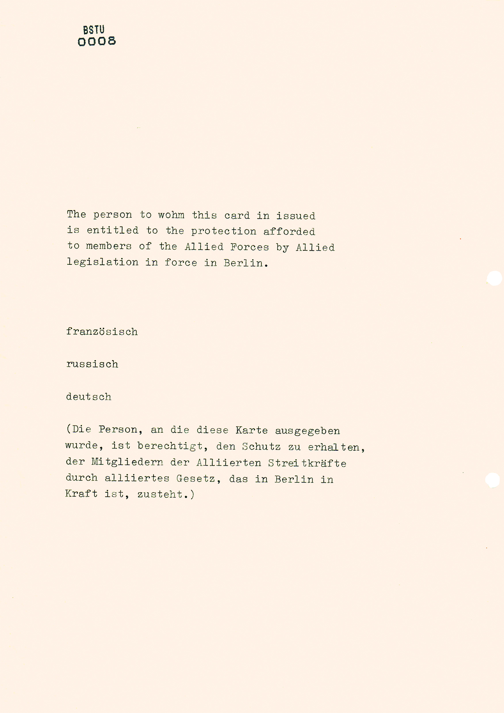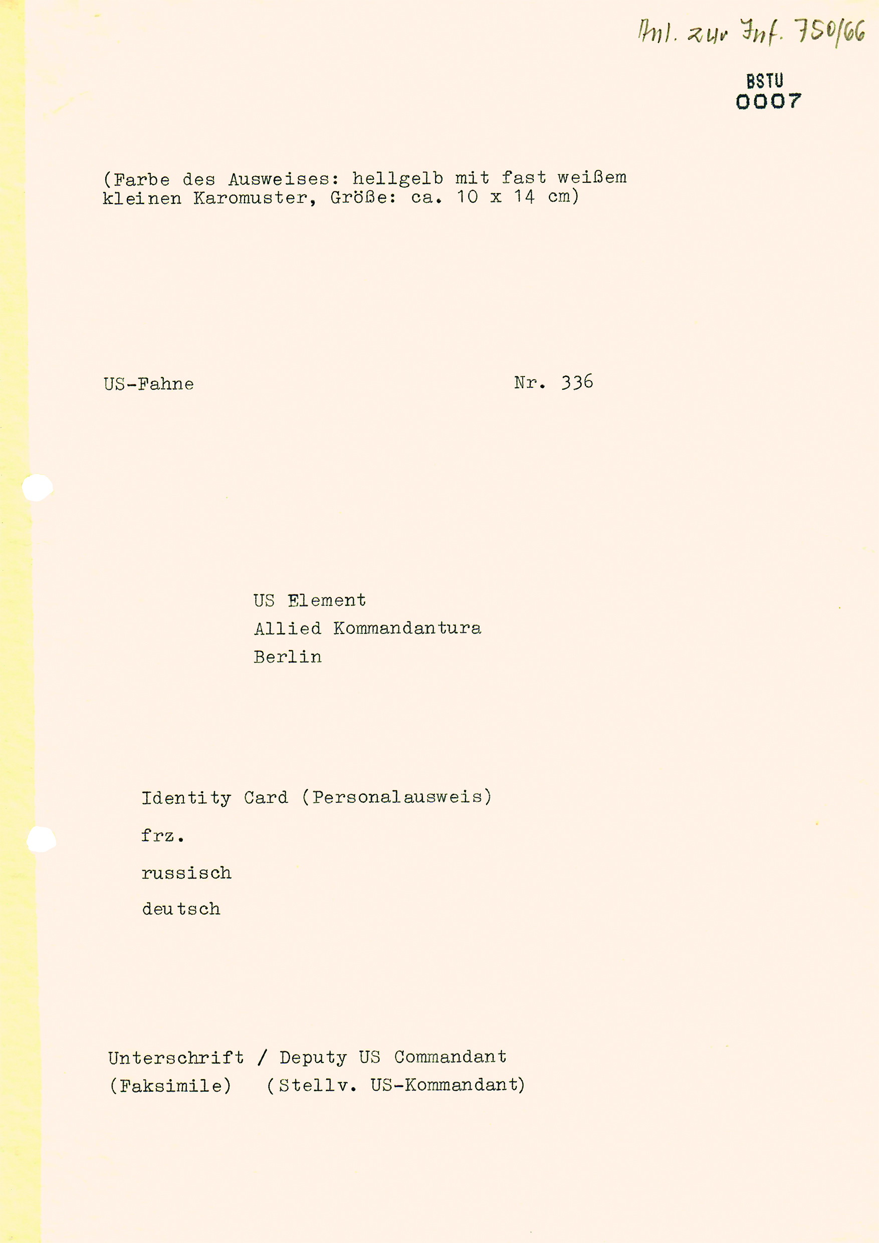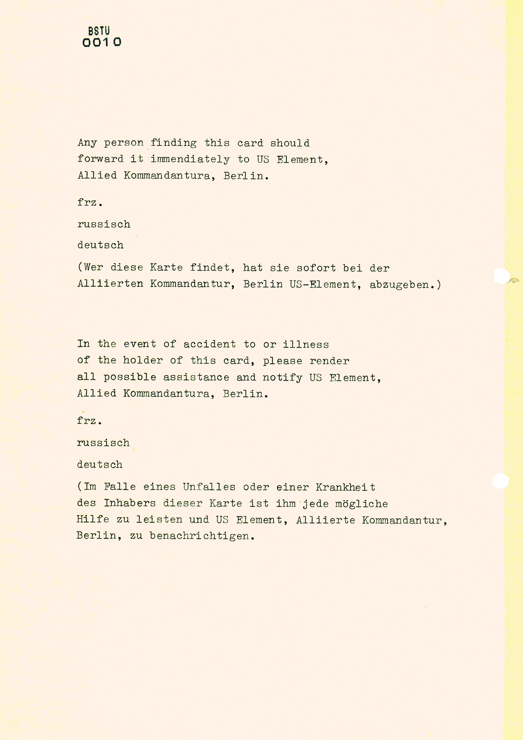 Nach unserer Auffassung ist es vom Standpunkt der Gewährleistung der Sicherheit unbedingt notwendig zu verhindern, dass mit Hilfe eines derart nichts aussagenden Dokumentes, wie es der neue Personalausweis der amerikanischen Kommandantur darstellt, möglich wird, faktisch mit bestimmten Kontrollbefreiungen in die Hauptstadt der DDR ein- und auszureisen und diese Kontrollbefreiungen zu missbrauchen.