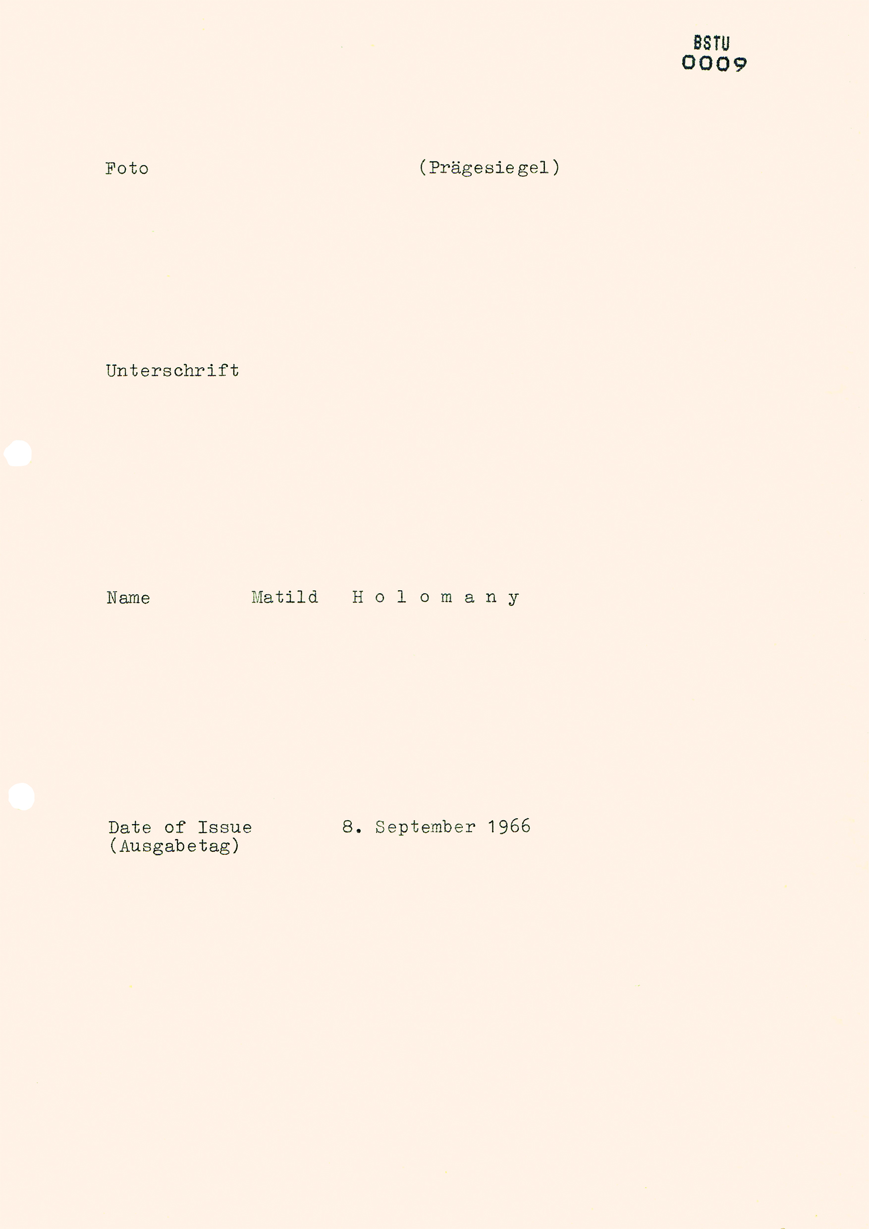 Von der USA-Bürgerin Holomany7 wurde bei ihrer Einreise am 15.9.1966 auf die Frage, warum sie nicht mit ihrem Diplomatenpass reise, sondern diesen neuen Ausweis benutze, geantwortet, dass zwischen den alliierten Streitkräften eine Vereinbarung getroffen wurde, nicht mehr den Diplomatenpass, den sie noch besitzt, sondern den neuen Personalausweis zu zeigen. Darüber wisse ein Herr Milko8 (phonetisch) von der sowjetischen Botschaft Bescheid. Es handle sich bei den USA-Bürgern mit diesen neuen Ausweisen um Diplomaten. Bei ihrer Einreise am 19.9. erklärte die Holomany, dass sie annehme, dass ein solches Dokument der sowjetischen Botschaft übergeben wurde. Genaue Auskunft darüber könne Livingston geben.