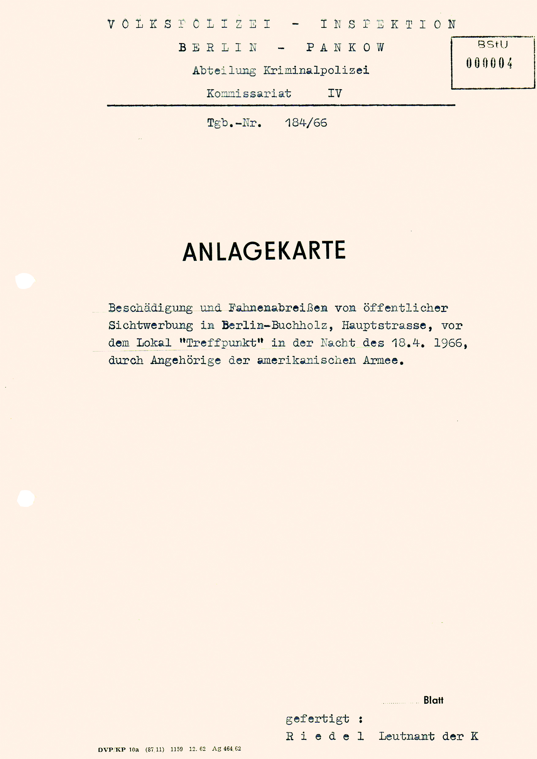 Am 18.4.1966 gegen 3.15 Uhr wurden durch Insassen des amerikanischen Fahrzeuges BC–73 in der Hauptstraße 73 in Berlin-Buchholz (Nähe der HOG »Treffpunkt«) 13 DDR-Flaggen (Größe 70 × 120 cm) gestohlen. Einen Teil der abgebrochenen Fahnenstiele ließen die Besatzer am Tatort liegen. Als ein Bürger über VP-Notruf die Volkspolizei alarmierte und der Notrufmelder ertönte, bestiegen die Besatzer ihr Fahrzeug und fuhren in Richtung Stadtmitte davon.
