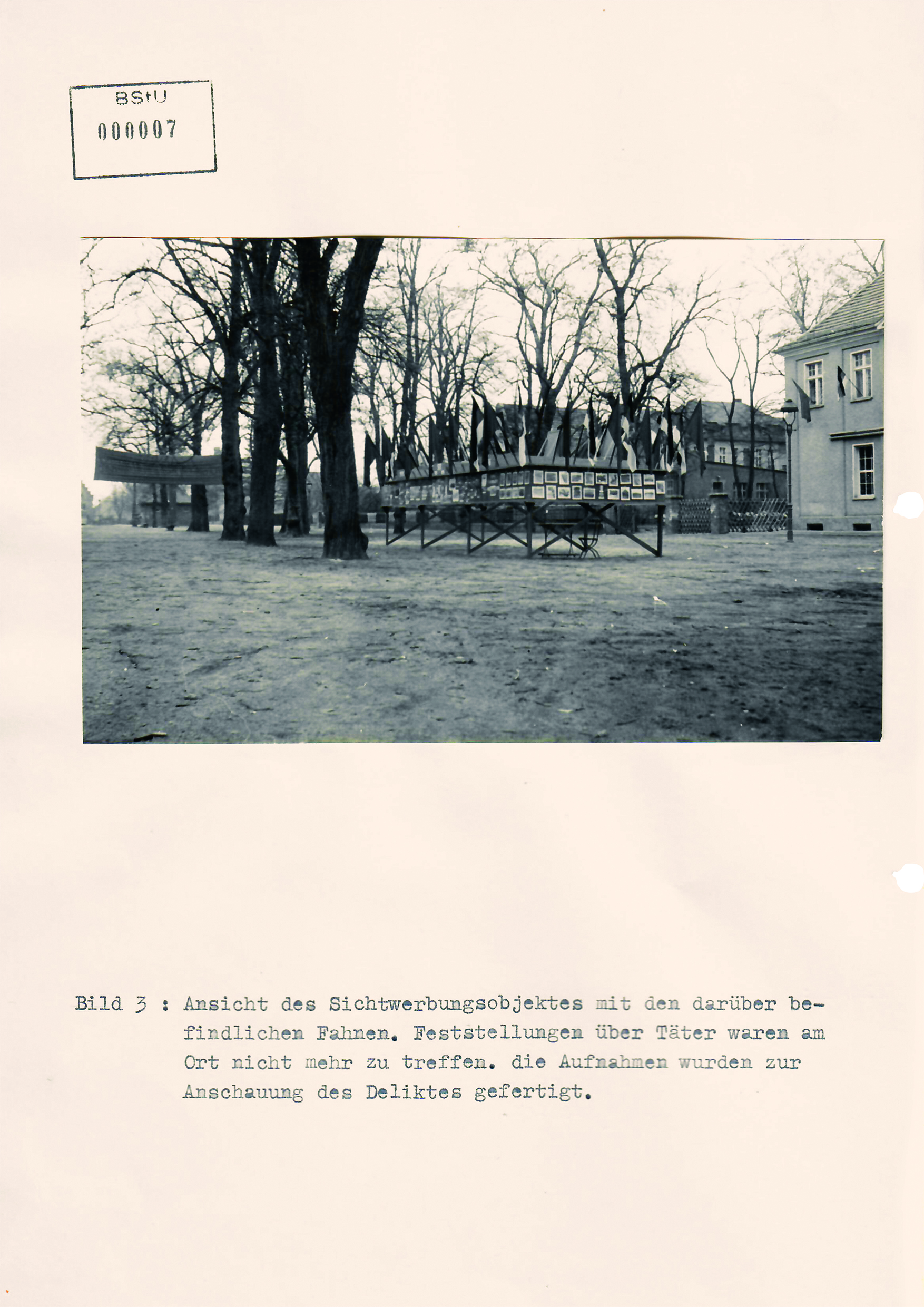 Weiter wurden zum gleichen Zeitpunkt ebenfalls in der Hauptstraße von Bäumen und von den Grundstücken 22, 32, 40, 41, 43, 65 und 74 insgesamt 13 DDR-Staatsflaggen und drei rote Fahnen entwendet. Offensichtlich handelt es sich bei den Tätern ebenfalls um die Insassen des amerikanischen Militärfahrzeuges BC–73.
