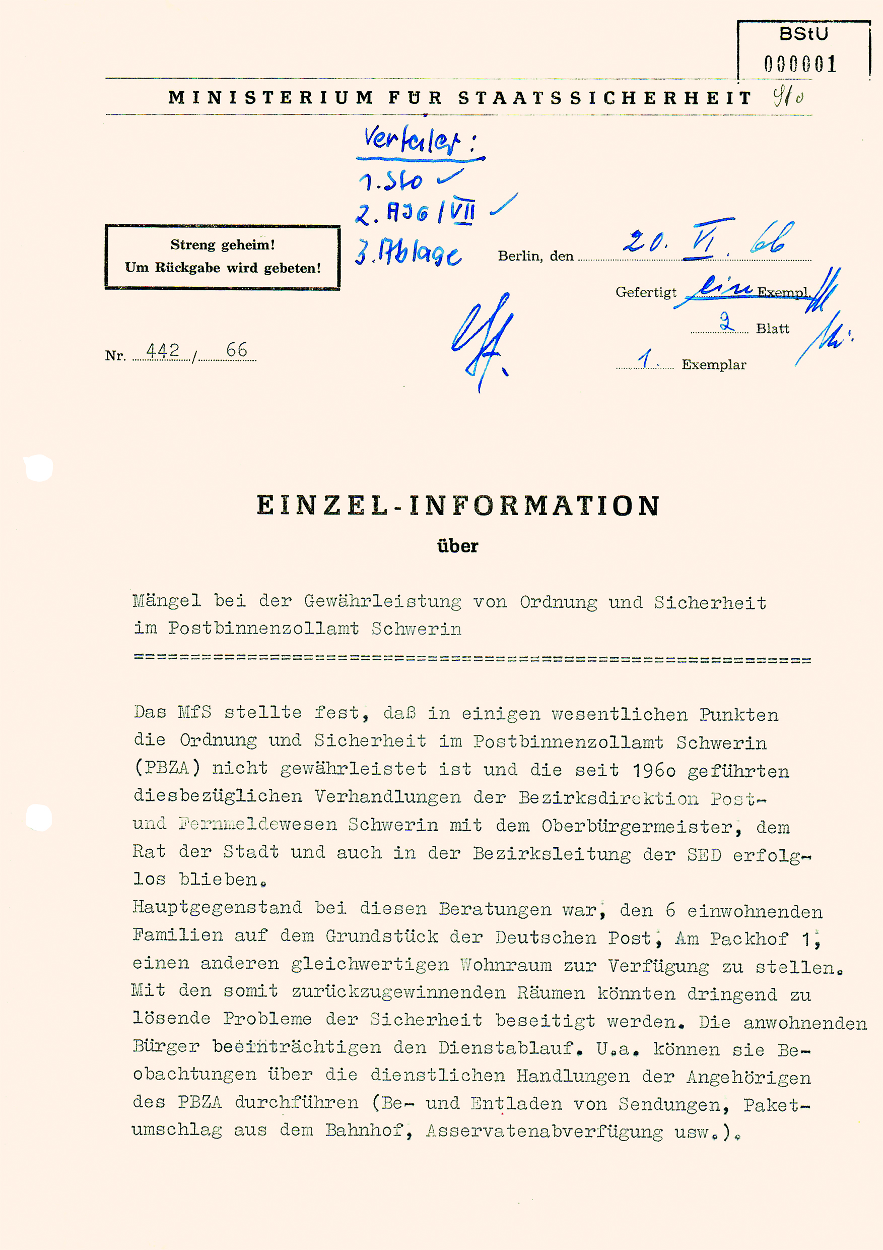 Einzelinformation Nr. 442/66 über Mängel bei der Gewährleistung von Ordnung und Sicherheit im Postbinnenzollamt Schwerin