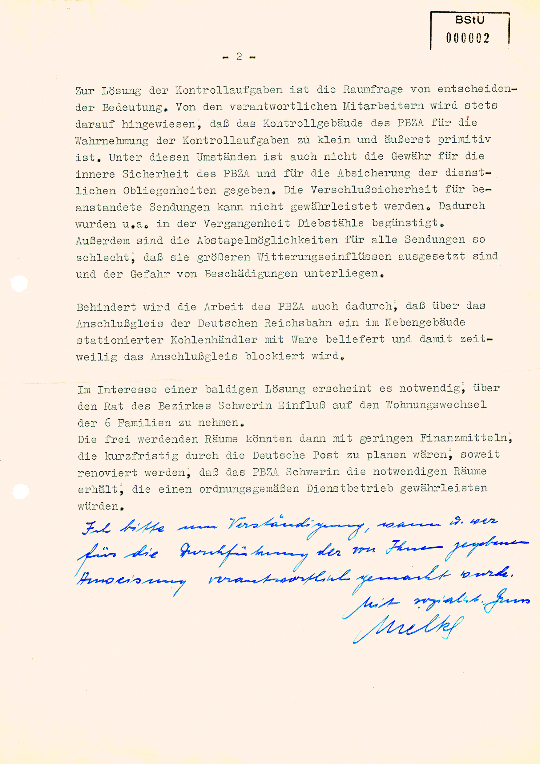 Das MfS stellte fest, dass in einigen wesentlichen Punkten die Ordnung und Sicherheit im Postbinnenzollamt Schwerin (PBZA) nicht gewährleistet ist und die seit 1960 geführten diesbezüglichen Verhandlungen der Bezirksdirektion Post- und Fernmeldewesen Schwerin mit dem Oberbürgermeister, dem Rat der Stadt und auch in der Bezirksleitung der SED erfolglos blieb.
